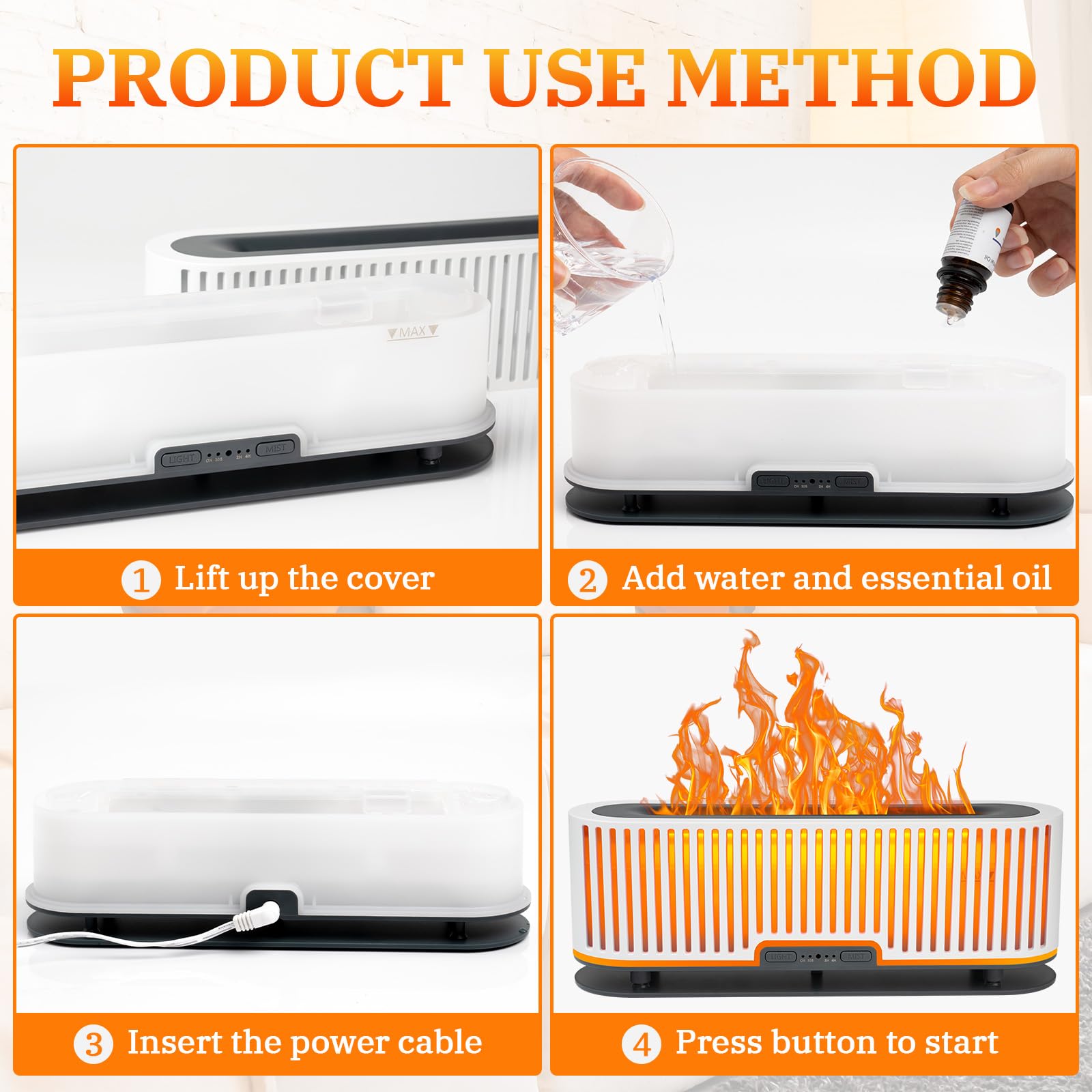 - 【4-IN-1 Air Diffuser】Our flame oil diffuser can be used as an aromatherapy diffuser, mist humidifier, romantic mood light and night light. Add 3-5 drops of your favorite essential oil during use to relieve fatigue,moisturize your skin and create a perfect comfortable environment.