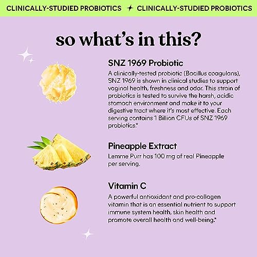 • SUPPORTS FEMININE HEALTH: Lemme Purr is an innovative women's health probiotic gummy formulated to support vaginal health, freshness, odor and healthy pH levels with 1 Billion CFUs of clinically-studied probiotic strain SNZ-1969. Plus antioxidant Vitamin C and 100 mg of real pineapple per serving.*