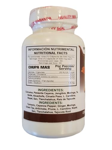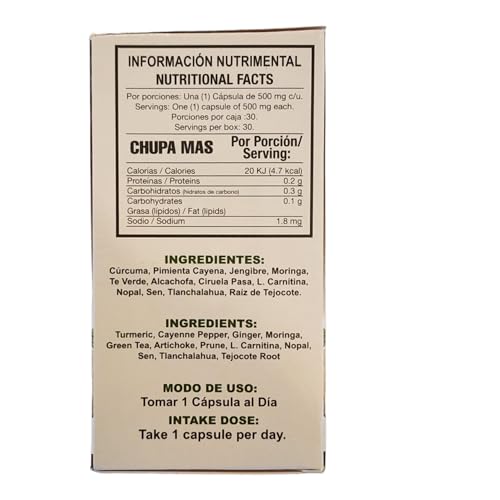 Details: CHUPA MAS 60 CAPSULAS Ginger, Green Tea, Prune, Tejocote Root. 500 mg each INGREDIENTS: Turmeric, Cayenne Pepper, Ginger, Moringa, Green Tea, Artichoke, Prune, L. Carnitina, Nopal, Sen, Tlanchalahua, Tejocote Root. HOW TO USE: Take 1 capsule per day. NUTRIMENTAL INFORMATION: Please see in images. INSTRUCTIONS FOR CONSERVATION: Keep in a cool and dry place. Keep out of reach of children. THIS PRODUCT IS NOT A MEDICINE. THE CONSUMPTION OF THIS PRODUCT IS RESPONSIBILITY FOR WHO RECOMMENDS IT AND WHO USES IT. GOLD EDITION.......................... CHUPA MAS 60 CAPSULAS Jengibre, Té Verde, Ciruela Pasa, Raíz de Tejocote. 500 mg c/u. INGREDIENTES: Cúrcuma, Pimienta Cayena, Jengibre, Moringa, Té Verde, Alcachofa, Ciruela Pasa, L.Carnitina, Nopal, Sen, Tlanchalahua, Raíz de Tejocote. MODO DE USO: Tomar 1 cápsula al día. INFORMACIÓN NUTRIMENTAL: Favor de ver en imágenes. INSTRUCCIONES PARA SU CONSERVACIÓN: Manténgase en un lugar fresco y seco. No se deje al alcance de los niños. ESTE PRODUCTO NO ES UN MEDICAMENTO. EL CONSUMO DE ESTE PRODUCTO ES RESPONSABILIDAD DE QUIEN LO RECOMIENDA Y DE QUIEN LO USA. GOLD EDITION