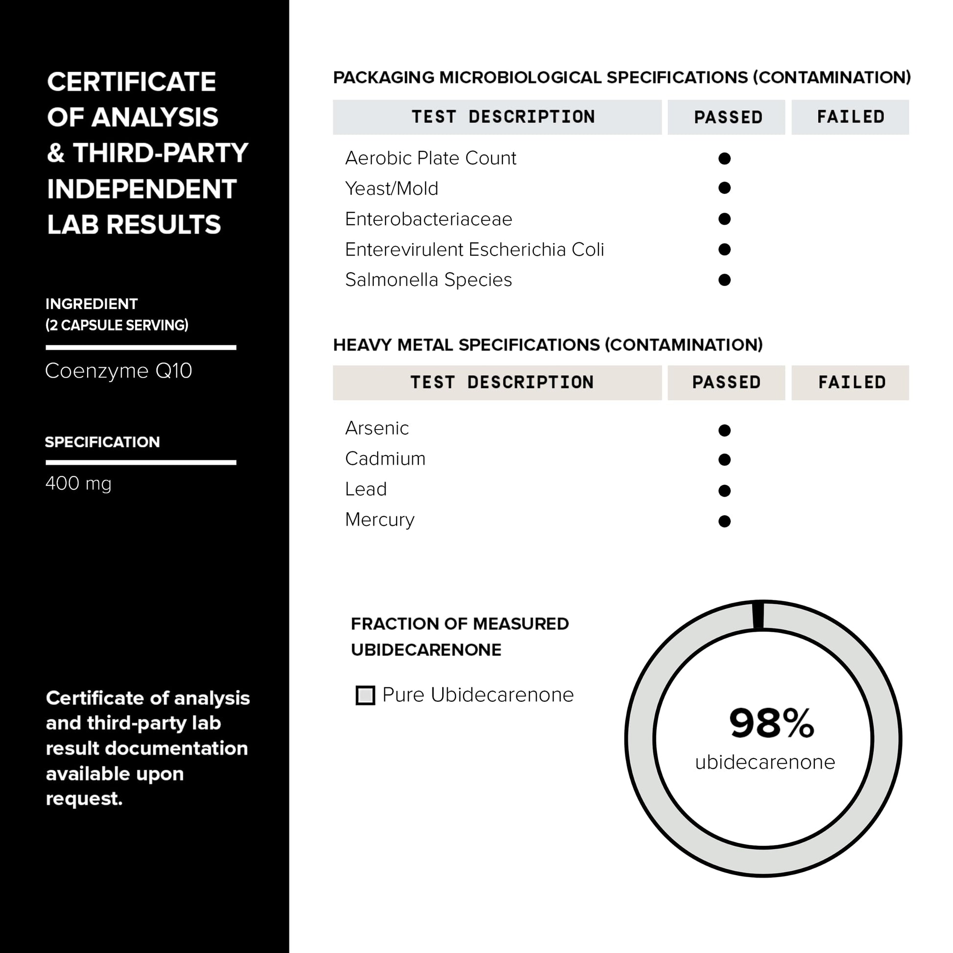 - The Highly Purified Form of CoQ10 - Toniiq CoQ10 Capsules contain 400mg of the highest quality Coenzyme Q10 powder in each serving– crafted to ensure 98% standardized purity (other co q 10 supplement products won’t disclose their purity levels).