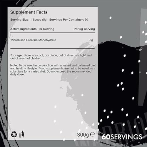 Warrior Creatine is a food supplement, and should be used as part of a balanced and varied diet. Do not exceed recommended dose. Store out of the reach of children. Please consult your Doctor prior to use if you have a medical condition. Not recommended for pregnant or lactating women. Produced in an environment that produces Milk, Egg, Soy, Wheat, Peanuts and Nuts.