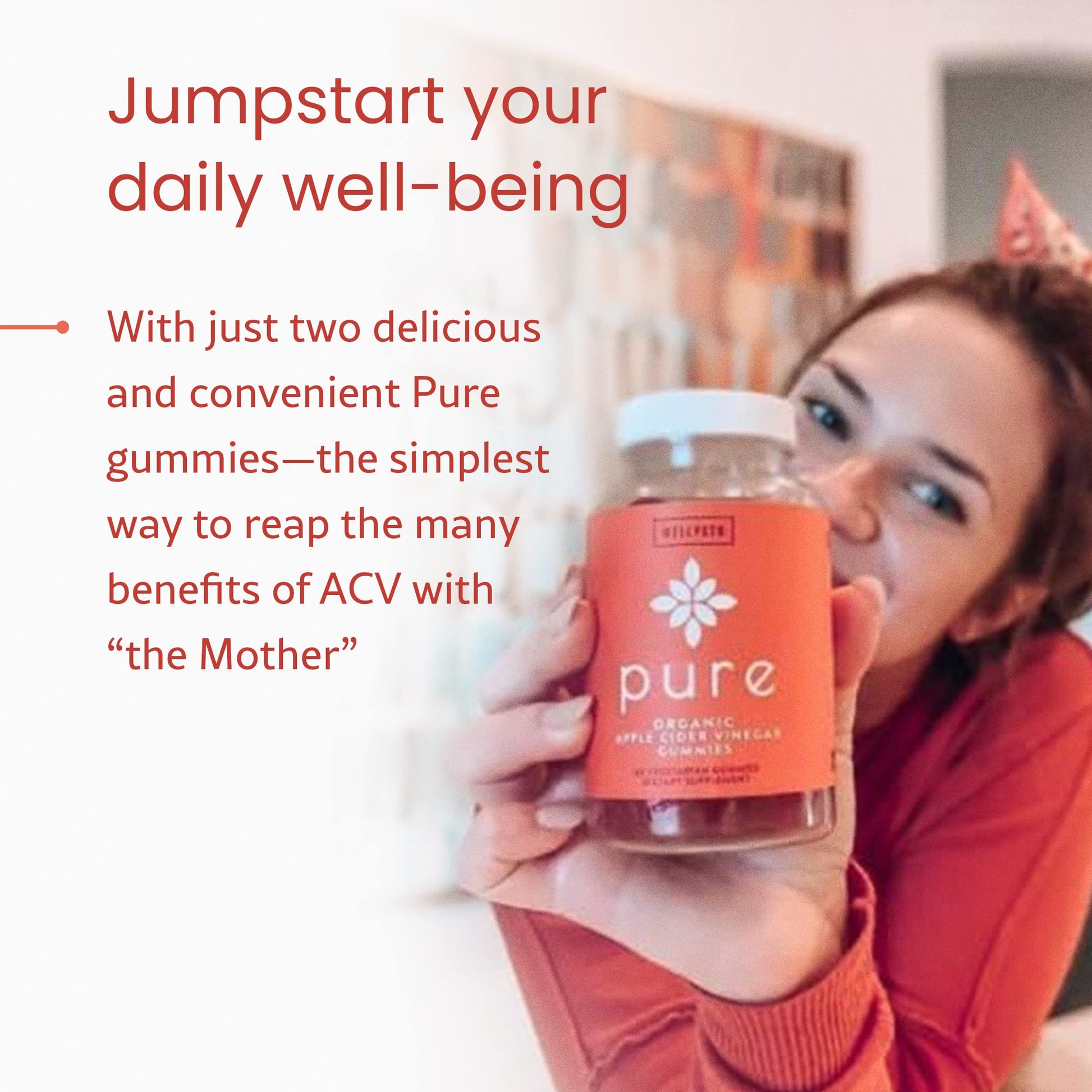 • [Organic Apple Cider Vinegar Gummies] Each bottle of Pure has 60 delicious USDA Organic apple cider vinegar gummies with "the mother.” Each serving has acetic acid that may help cleanse your body and support digestion.