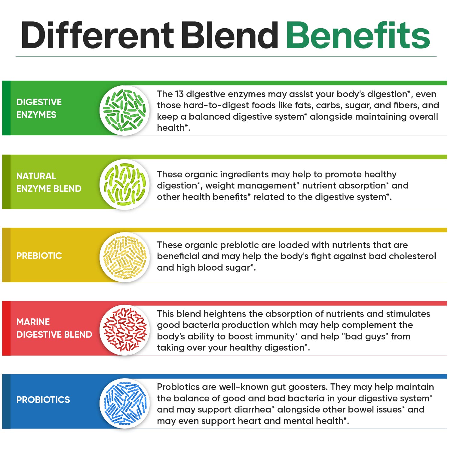 • Relieve Gas, Belly Bloating / Bloat, Constipation, Leaky, Indigestion, Reflux, Belching & Acid Discomfort! Aid gut health, beauty & bloated stomach comfort. Prebiotic fiber, probiotic encapsulation(Lactobacillus acidophilus, plantarum, casei, salivarius, bulgaricus and Bifidobacterium lactis, bifidum, breve, longum), & enzymes support gut flora bacteria, bile, nutrient absorption, motility, & enzyme levels your body isn't producing as you age.