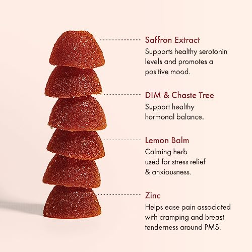 - INTENTIONAL BALANCE: These pms relief gummies for mood swings and all PMS symptoms help to promote healthy hormonal balances by using Saffron extract to support healthy serotonin levels and positive mood.