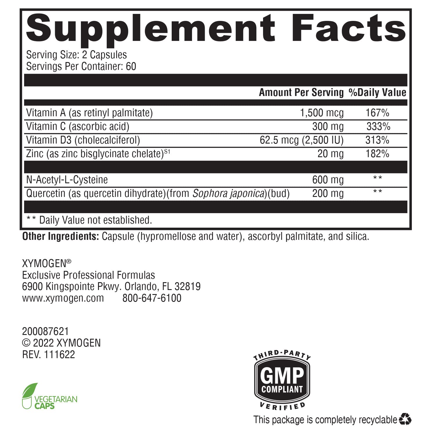 - With FOlate + Vitamin D3 - Includes D3 vitamin (2,500 IU per serving), ascorbic acid vitamin C, NAC (N-Acetyl-L-Cysteine - an antioxidant supplement and precursor to glutathione), quercetin, vitamin A, and a chelated zinc supplement.